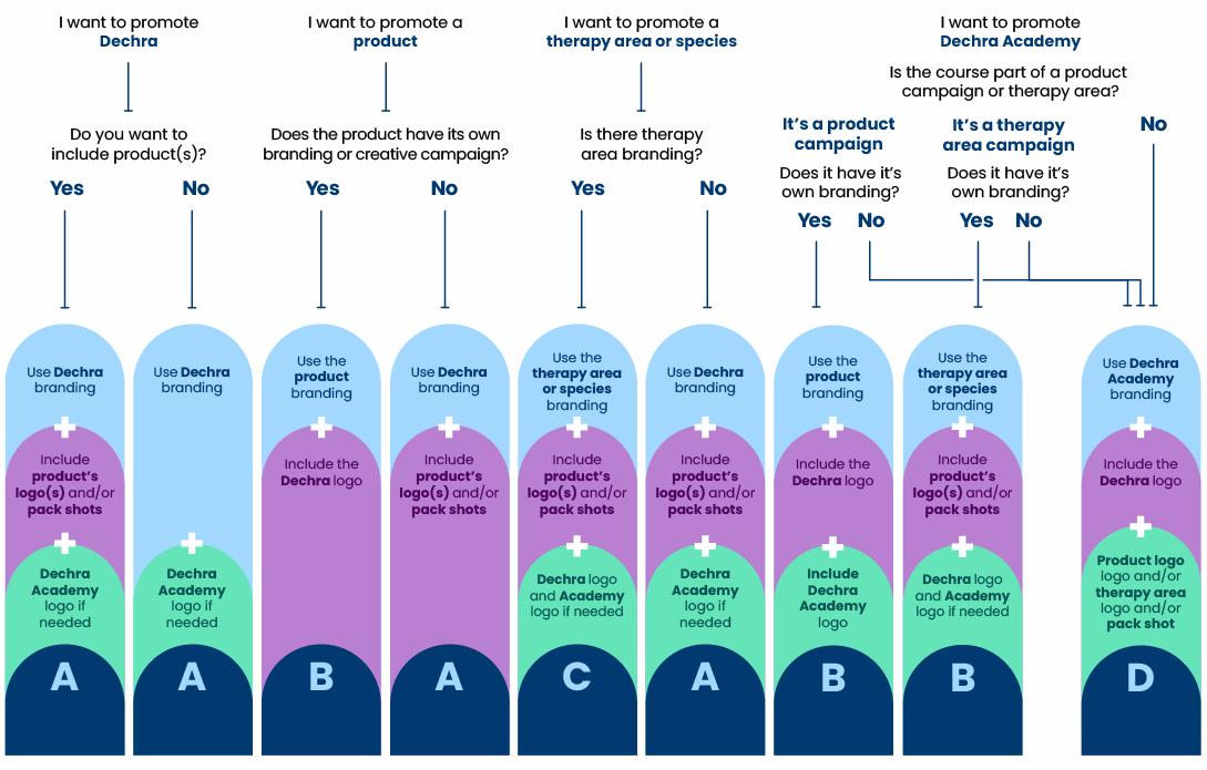 It is important to identify the objective of the asset first. Use this decision tree to identify the brand hierarchy required. The brand hierarchy is listed at the bottom of the tree, which includes:
