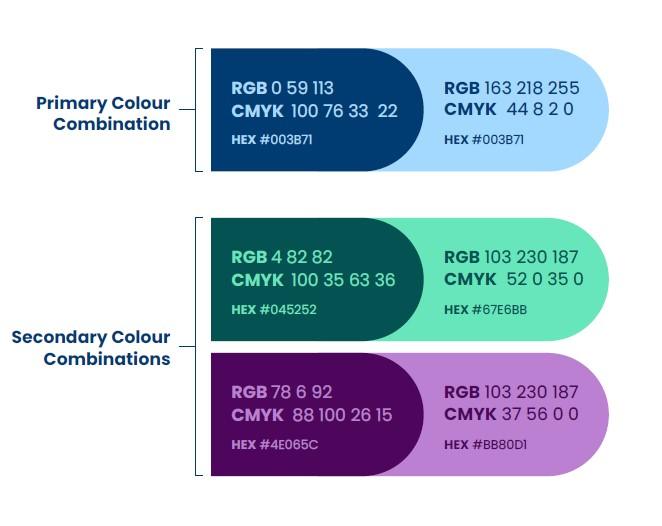 The colours must be used in the specified combinations and not combined. E.g, Do not place pale blue text over dark green background.
