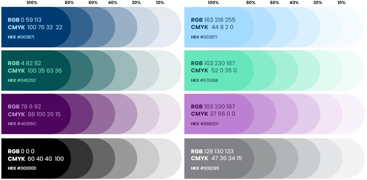 Brand colours should be used at 100%, however, it is possible to utilise tints at lower percentages for secondary graphics, such as graphs or charts. These should be used at the percentages indicated below and not combined in a gradient.