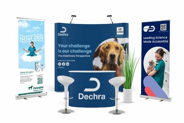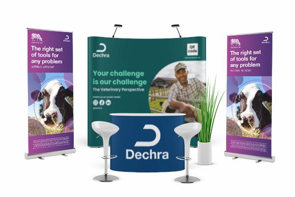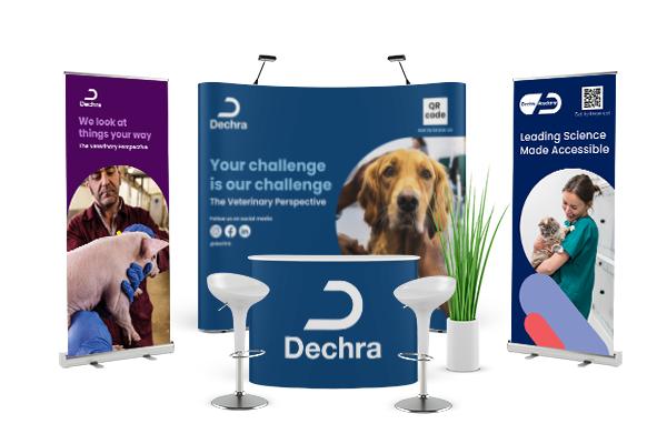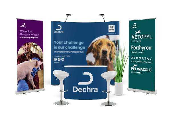 Secondary: Product branding (Product logos treated in white over Dechra brand colour.)