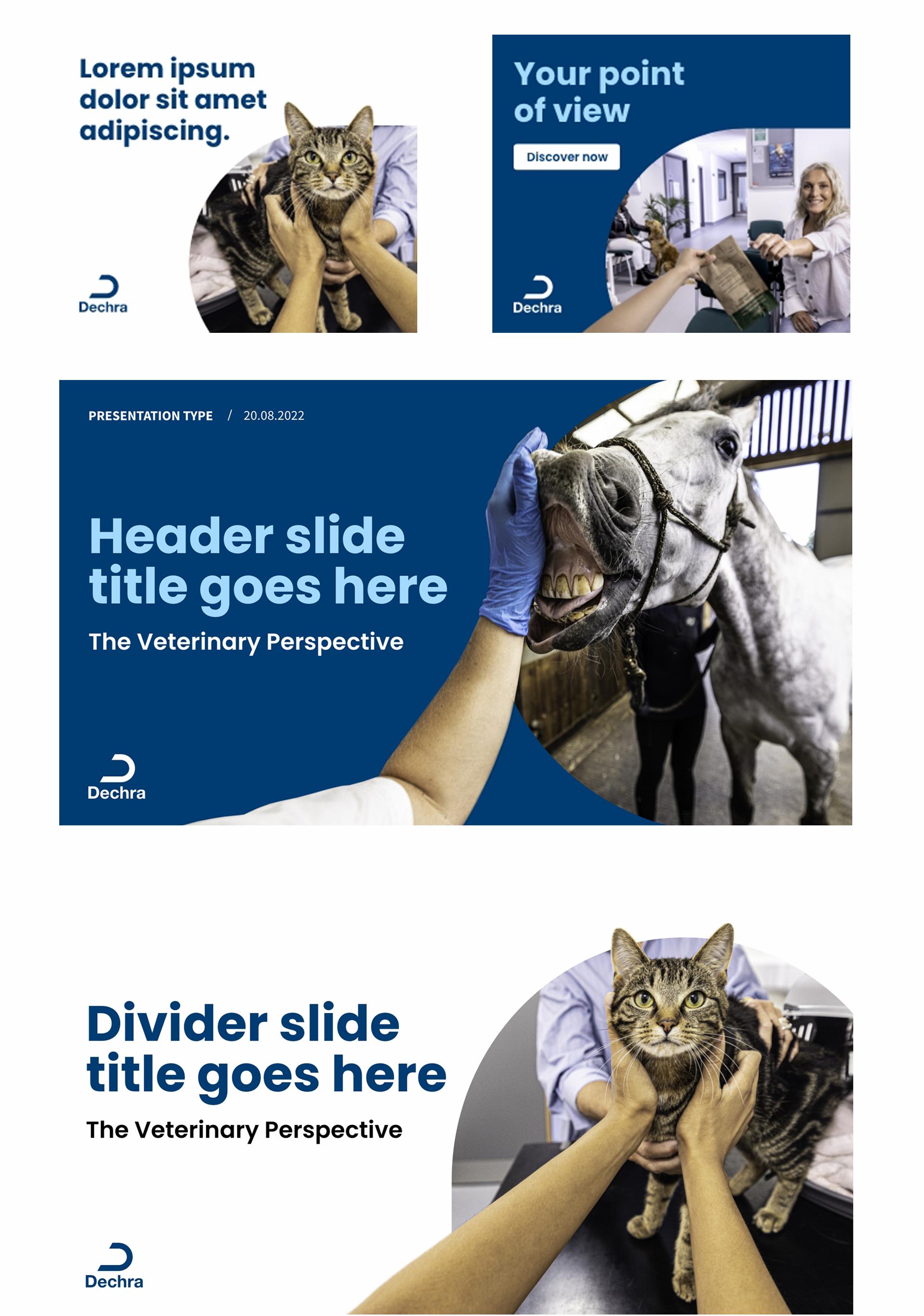 Product logos, therapy area logos and/or the Academy logo can be included in addition to this, but these must be smaller than the lead Dechra logo and positioned in one of the other corners. In this case, all associated logos can be treated in white, and placed over a Dechra brand colour to adhere to the Dechra brand guidelines.